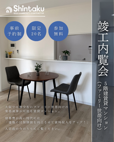 大阪では数少ない、楽器演奏可能なファミリー世帯向け賃貸マンションの竣工内覧会を実施いたします。